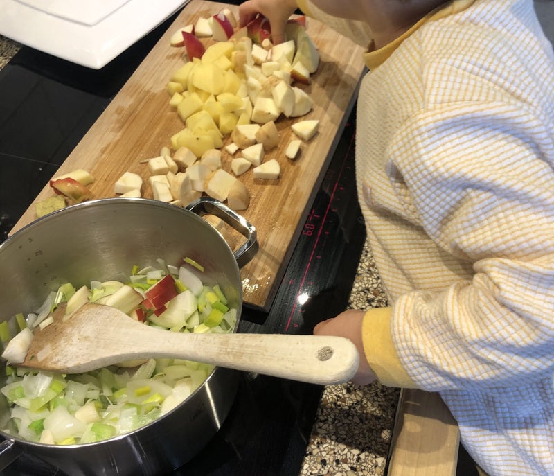 3. De aardappels, pastinaak, appel en bouillonblokjes gaan ook in de pan. Goed roeren.